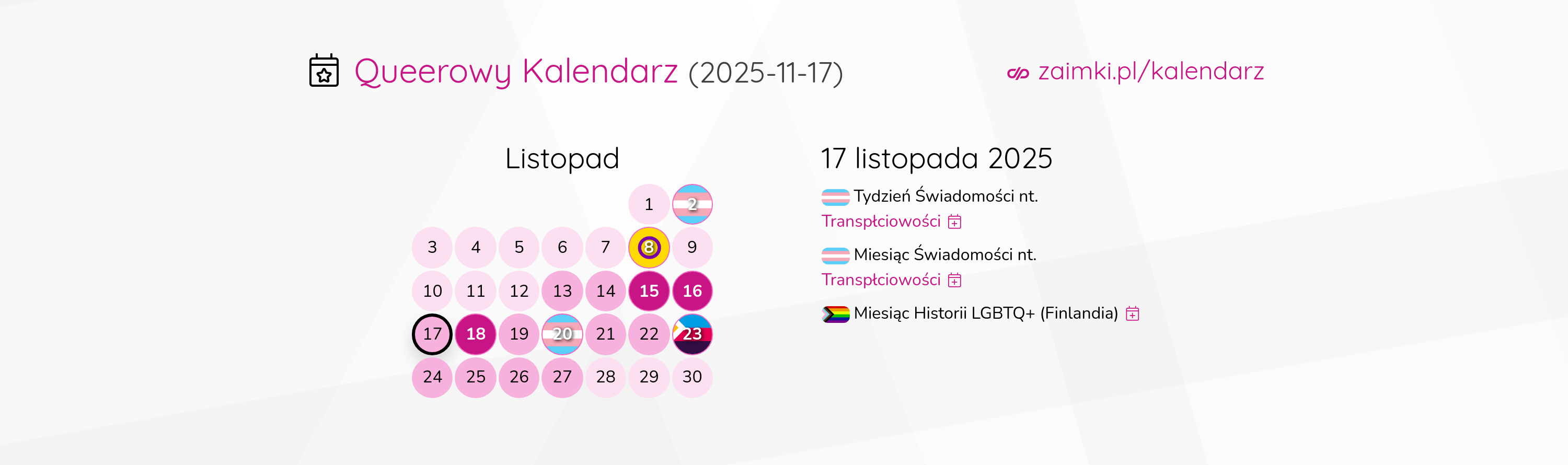 Opis obrazka: A rectangular flag with five equal-width horizontal stripes: blue, pink, white, pink, blue Miesiąc Świadomości nt. Transpłciowości