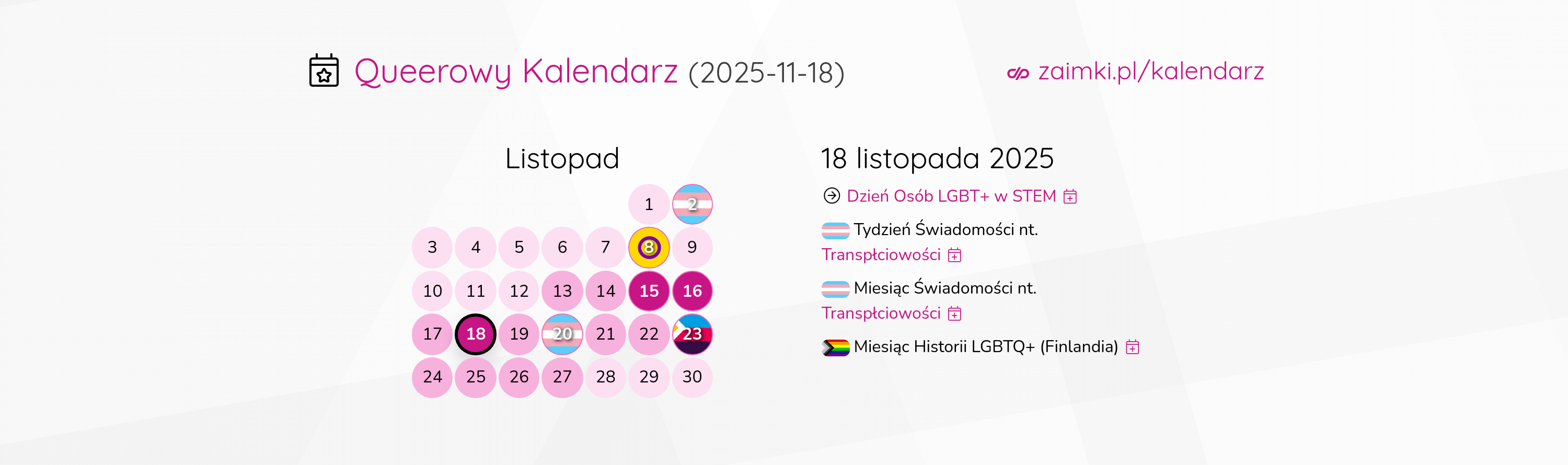 Opis obrazka: A rectangular flag with five equal-width horizontal stripes: blue, pink, white, pink, blue Miesiąc Świadomości nt. Transpłciowości